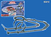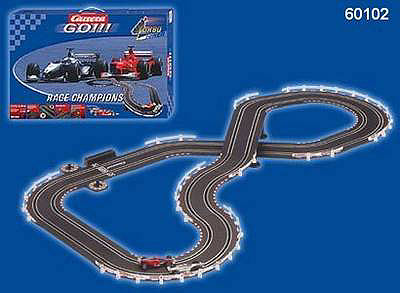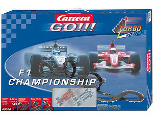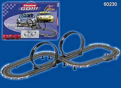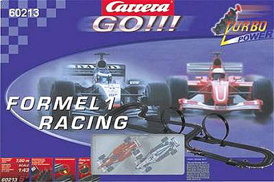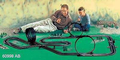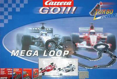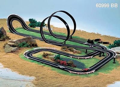 Rasante Streckenführung über 6,80 bzw. 6,90 m Fahrbahnlänge mit 2 integrierten Loopings. Komplett mit 2 Formel-1 Rennwagen, Rundenzähler, 2 Turbo-Handreglern, Trafo und Leitplanken