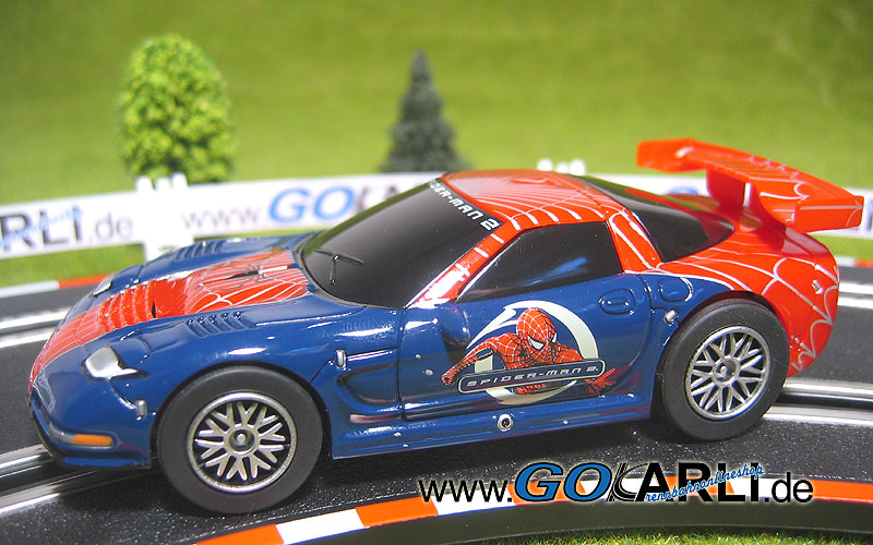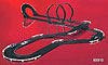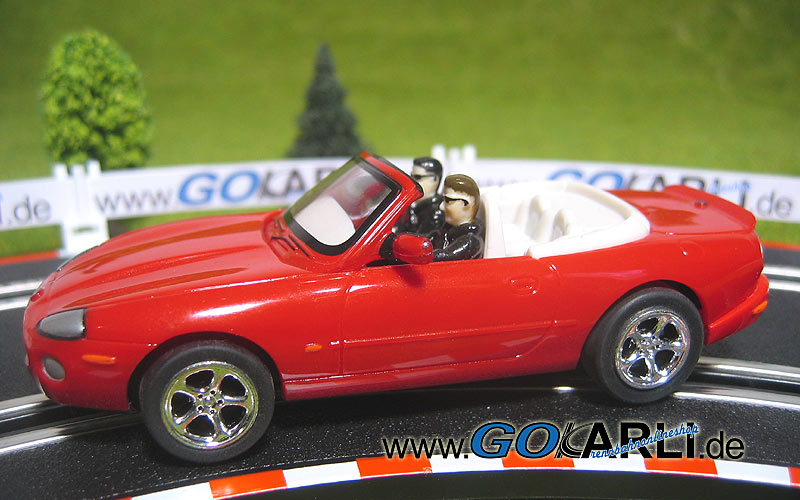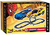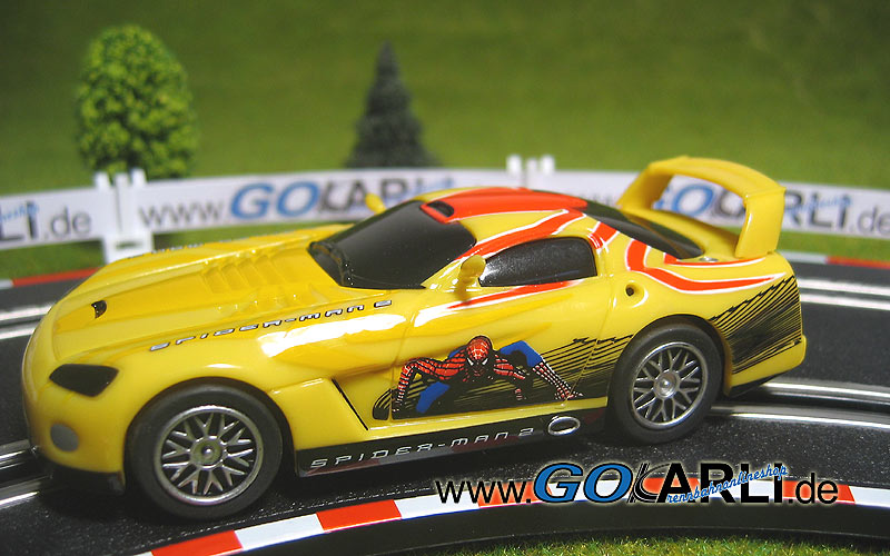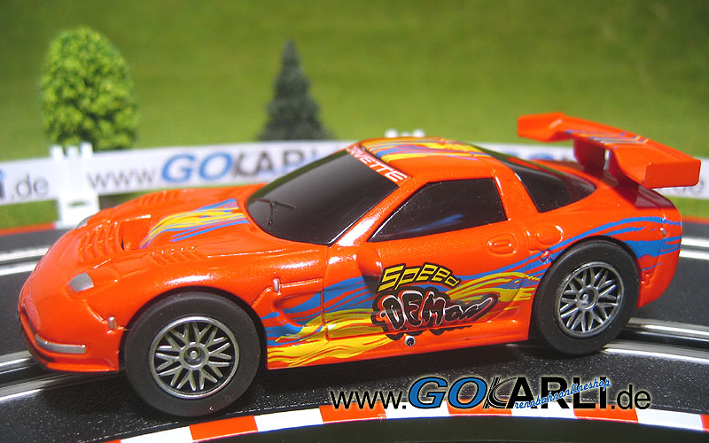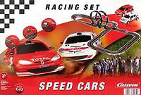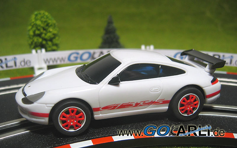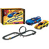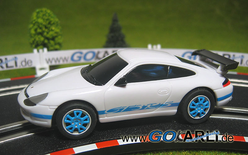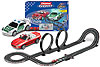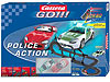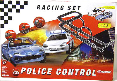 Die Grundpackung mit 5,90 m Strecke beinhaltet einen tamponbedruckten Porsche GT3 "Polizei" mit funktionierendem Blaulicht, einen Jaguar XKR, Fly Over und Engstelle.
