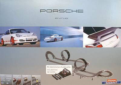 Komplettset im Maßstab 1:43, mit Trafo (220 V) und Handreglern, inklusive elektronischem Rundenzähler, 2 Loopings, Engstelle, 2 Modelle des Porsche 911 GT3 RS mit roter und blauer Dekoration, Streckenlänge: 9,5 m, Aufbaumaß: 277 x 116 cm, Metall/Kunststoff.