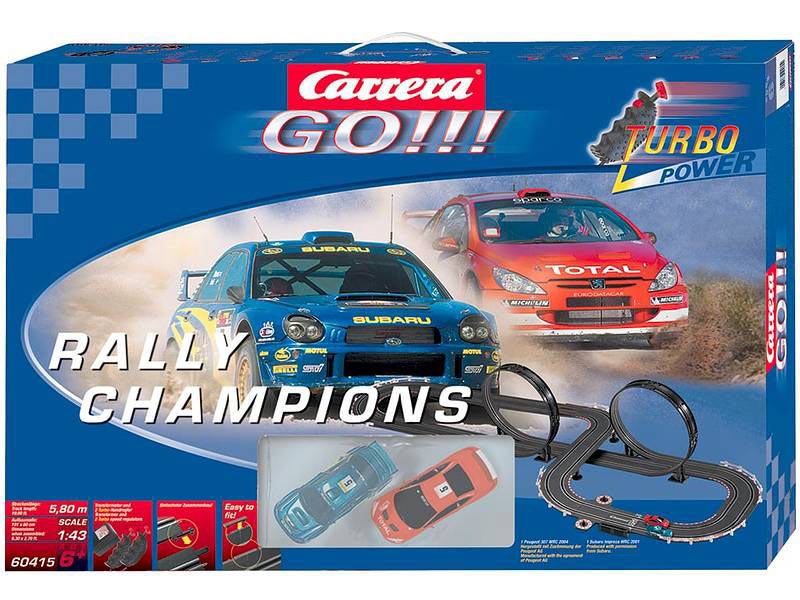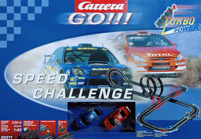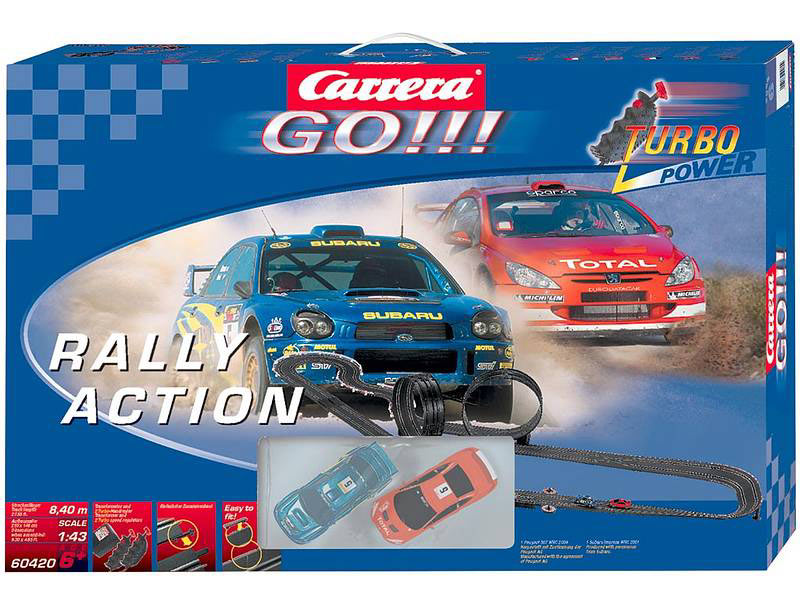 Brandaktuelle WRC-Autos für das Nachspielen der schwierigsten Sonderprüfungen in der Rally-Weltmeisterschaft! Der Peugeot 307 WRC 2004 kommt sozusagen frisch aus der Motorsportabteilung des französischen Konzerns und soll die Nachfolge des Peugeot 206 WRC antreten. Der Subaru Impreza WRC in der neuesten Evolution ist dagegen über Jahre gereift und immer vorne bei der "Musik". Das Set mit 8,4 m Streckenlänge beinhaltet unter anderem Turbo-Handregler, 2 Loopings, 2 Jumps, Steilkurven sowie 2 Spurwechsel.Mit diesen Aktionelementen sind spektakuläre Rennen garantiert.