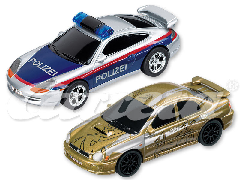Auf einer Spurlänge von 7,3 m kämpft der Porsche GT3 "Polizei Österreich" mit Blaulicht für Recht und Ordnung! Doch kann sich der Subaru Impreza WRX "Kanji" mit coolem Groundlight aus der Affäre ziehen? Action-Features wie der Looping und die Sprungschanze sorgen für eine Extra-Portion Spielspaß...