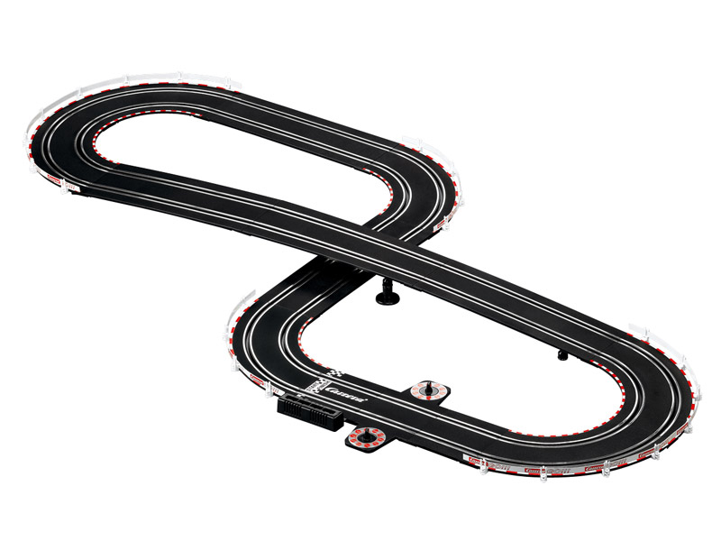 Die Grundpackung beinhaltet 7,3 Meter inclusive Looping, Steilkurve und 2 Spurwechseln. DasAufbaumaß ist 275 x 98 cm. In der Grundpackung sind zwei 2 CarForce-Fahrzeuge im Stock-Car-Design mit LED-Frontlichtern enthalten