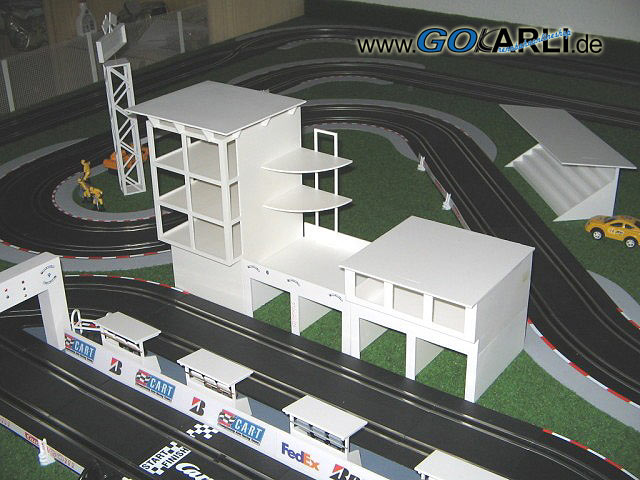 Für die Boxengasse gibt einfache Doppelgaragen mit verschieden Aufsätzen als Kabinen oder Siegerpodest.