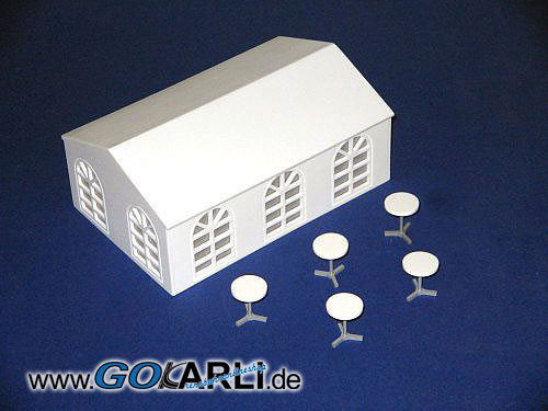 Natürlich braucht jede Rennstrecke auch eine Tribühne. Die bei uns erhältliche schlichte, aber sehr schöne Zuschauertribühne ist überdacht. Auch nicht fehlen darf ein Cateringzelt für die VIP's. Passend zum Vip-Zelt gibt es Stehtische für ein Glas Champagner im Freien.